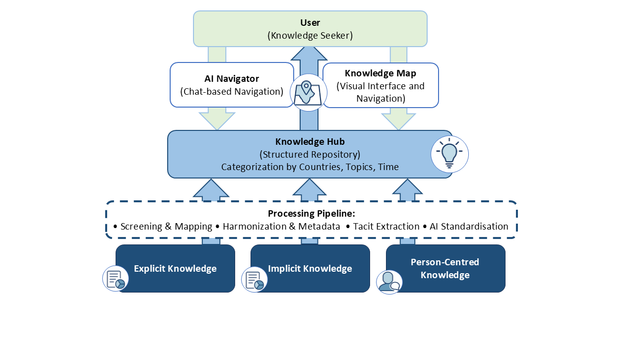 Explicit, implicit, and personal knowledge flows into the Knowledge Hub through a processing pipeline. It is stored in a structured repository, a central digital storage location that is categorized by country, topic, and time. Implementation initially involves standardizing knowledge structures, e.g., templates, terminology, and metadata, which are entered into the Knowledge Map and Hub. To avoid dependence on personal knowledge, semi-structured interviews with experts and group discussions are conducted and their results are summarized in the form of standardized knowledge capsules. These can then be reused in different regions and future program phases.
